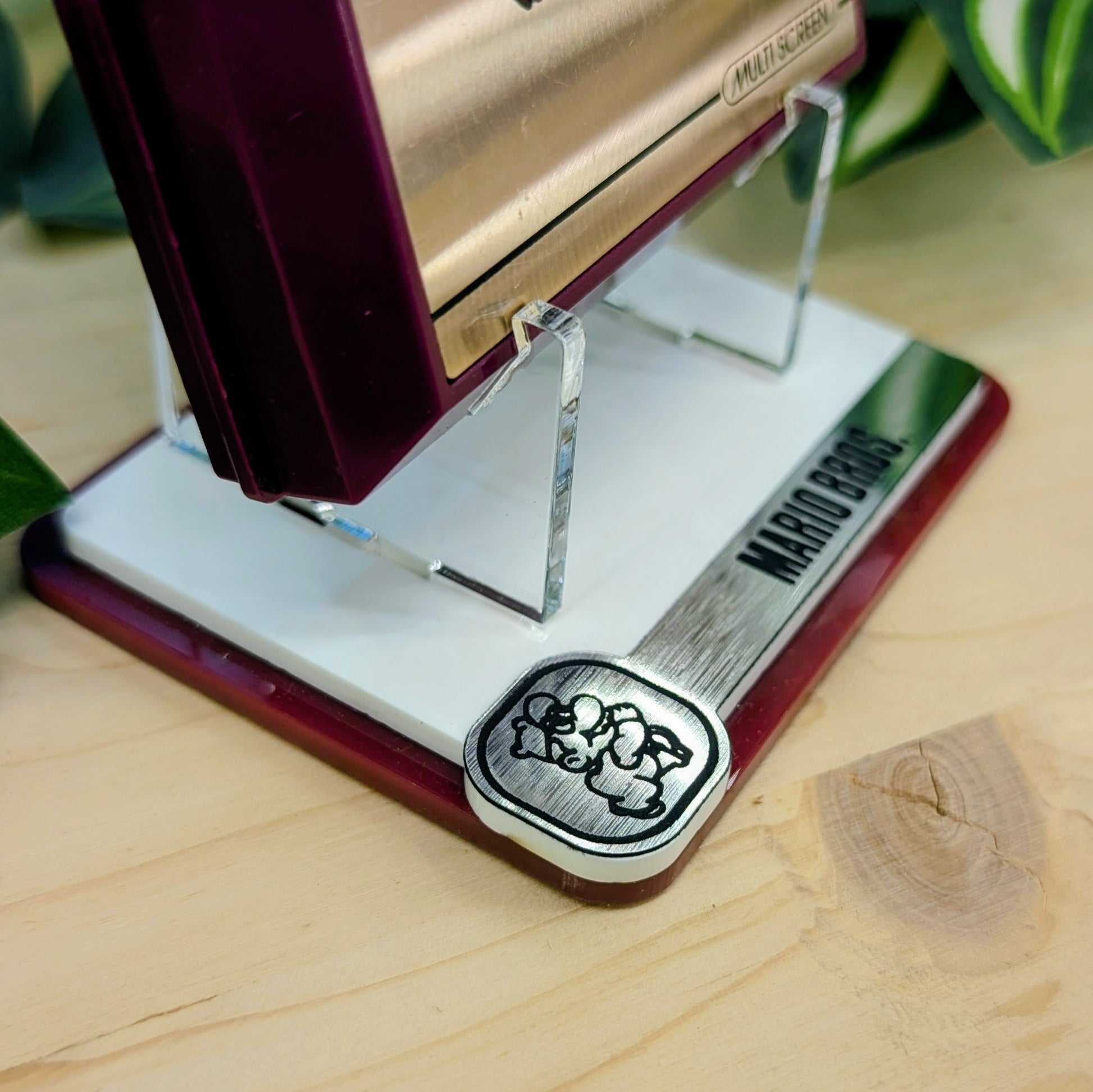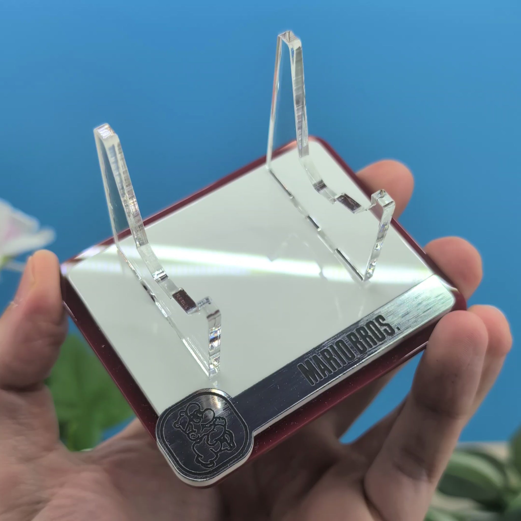 Fabriqué avec un acrylique de haute qualité, ce support élégant et robuste met en valeur la Game & Watch en reprenant ses couleurs, une gravure nominative discrète et un médaillon gravé effet aluminium brossé d'un sprite du jeu ! Le socle permet de présenter la console en position ouverte ou fermée !