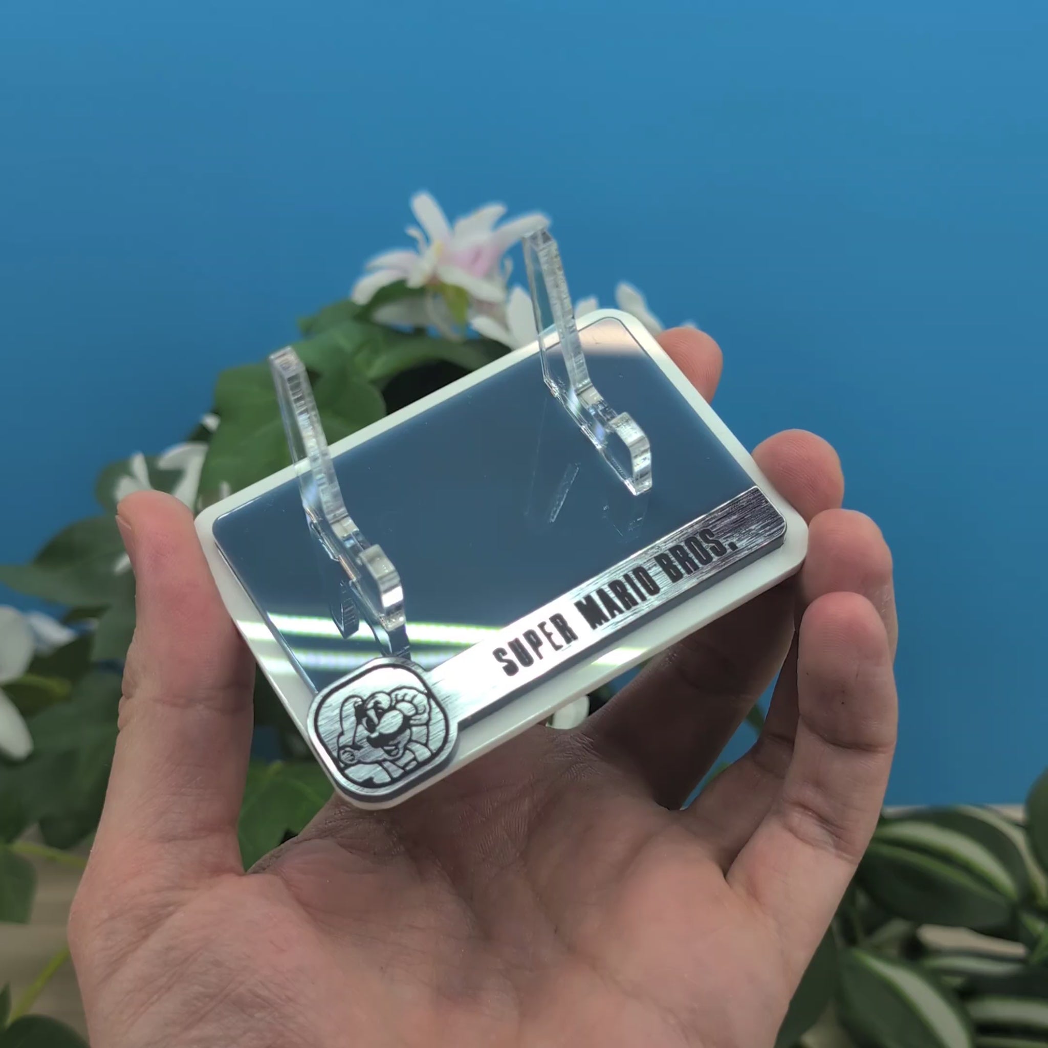 Fabriqué avec un acrylique de haute qualité, ce support élégant et robuste met en valeur la Game & Watch en reprenant ses couleurs, une gravure nominative discrète et un médaillon gravé effet aluminium brossé d'un sprite du jeu !